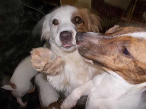 Do un’occhiata discreta ai cuccioli, sorrido come una beota, neanche li avessi partoriti io, scatto una foto ed Orlando è già tornata, abbasso una mano per farmi afferrare il pollice tra i denti e sacramento orribilmente dentro di me, perchè stringe da matti. E’ il suo bacetto del mattino. Siccome col solo respiro abbatte un bufalo a 10 metri, ringrazio la sorte per la masticata di pollice e vado ad aprire ai Superni che aspettano. In silenzio.