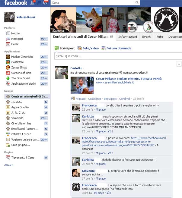 In compenso non ho mai visto pagine “contrarie ai metodi di Franco Rossi” (al posto del nome fittizio metteteci pure qualsiasi nome di addestratore macellaio italiano che conosciate…e lo dico soprattutto a coloro che sugli addestratori sputano veleno a tutto spiano, sostenendo che sono tutti macellai. Un nome e cognome ce l’avrete, no? Perché non lo criticate pubblicamente, spiegando cosa fa di sbagliato? Forse perché Cesar Millan sicuramente non vi legge, e “Franco Rossi” magari sì?).