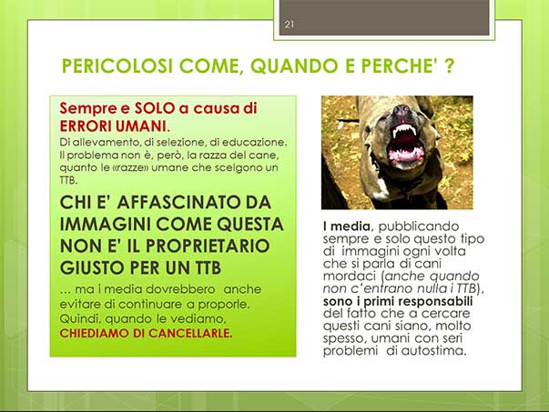 Una delle mie ultime slides sosteneva (e lo sostengo anche qui, con forza) che chi è attratto dall’immagine del cane “feroce” non è il proprietario adatto per un TTB.