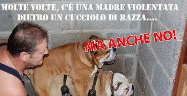 b) un’ipotetica cagna violentata urlerebbe di dolore e tenterebbe ovviamente di mordere: di sicuro non avrebbe la faccia di questa bulldog (che, prego notare, non è neppure legata a un guinzaglietto), a cui si potrebbe piazzare sulla testa il fumetto con scritto: “Uff, che palle, di nuovo un maschio sul groppone. Vabbe’, d’altronde sono in calore e Madre Natura mi impone di accettarlo, anche se ne farei volentieri a meno”.