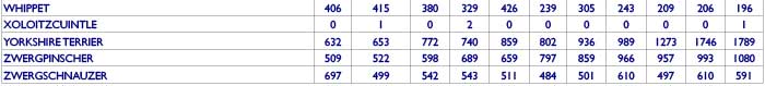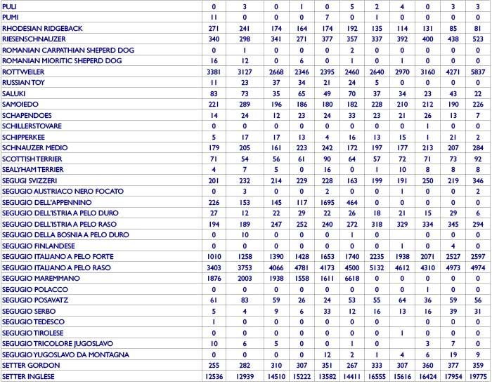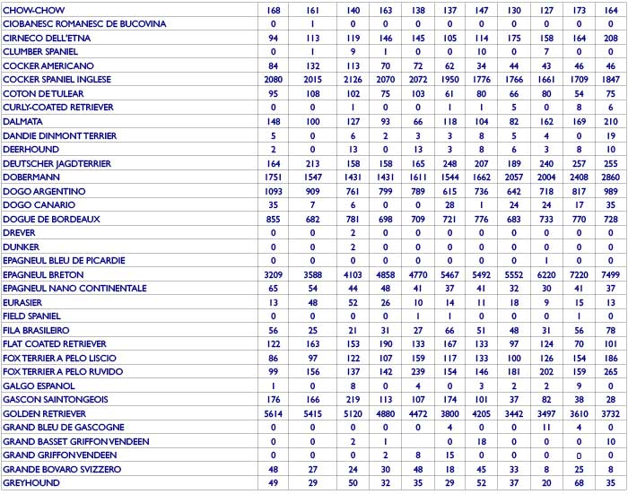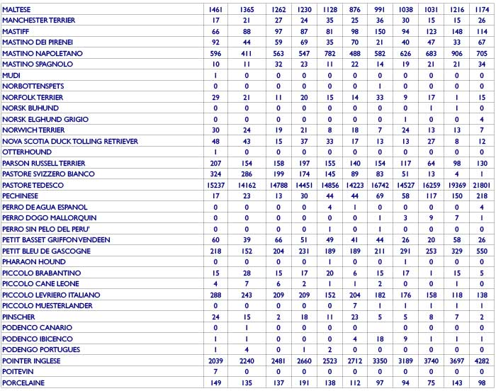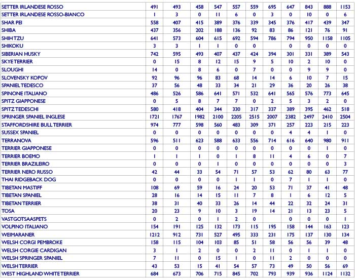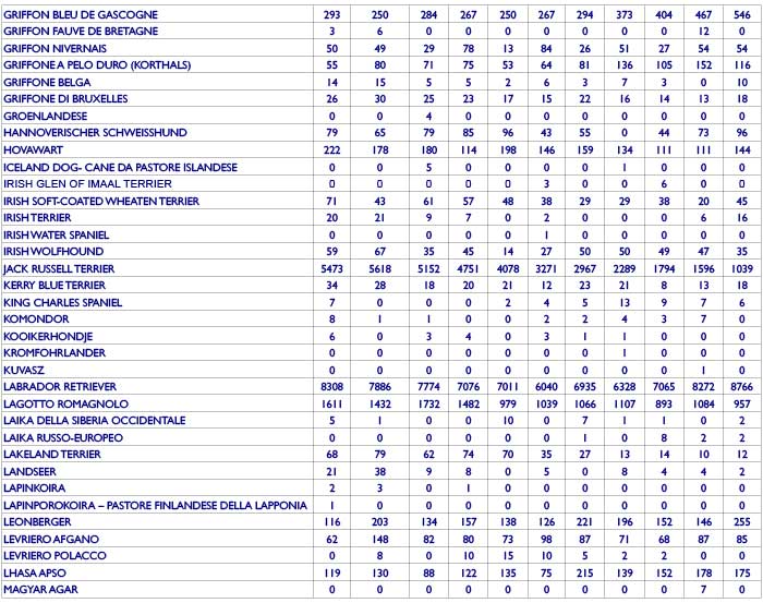 2. E’ triste vedere come, a parte il jack russell, tutti gli altri terrier stanno avendo un significativo calo e i levrieri come sempre sono pochissimi. Mi sorprendono il volpino italiano e il chow chow, vedendone a fiotte pensavo fossero molto più diffusi, devo quindi ipotizzare che la maggior parte dei cani che vedo non abbiamo pedigree? E si spera che la moda del CLC passi in fretta… cani stupendi ma troppi in mano a persone sbagliate!