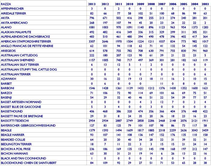 razze_mucchiodi VALERIA ROSSI, con furto a DENIS FERRETTI – Sono arrivate le statistiche ENCI 2013, ovvero “i numeri” delle iscrizioni ai Libri Genealogici italiani: e quelle le potete visionare direttamente sul sito dell’ENCI. Un cinofilo veramente pazzo, però, e cioè il nostro Denis Ferretti, è andato molto oltre ed ha fatto qualcosa che finora non mi risulta fosse mai stato neppure tentato: si è messo lì ed ha stilato una tabella comparativa con le iscrizioni ai libri genealogici degli ultimi 11 anni, ovvero dal 2003 al 2013 compresi.