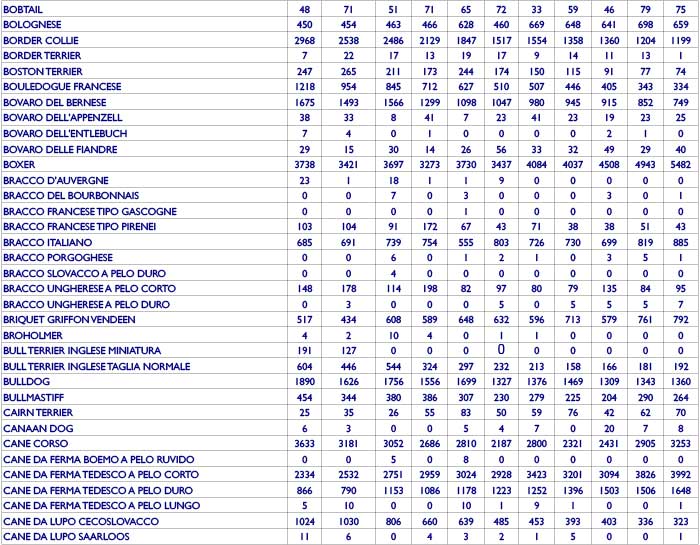1. Davvero molto interessante. Mi ha abbastanza stupito il boxer, credevo fossero molti meno. Impressionante il tracollo che ha avuto dal 2003 al 2008 con quasi -60%… sarebbe interessante se qualcuno ne sapesse qualcosa di più sui motivi. Non mi sembra sia mai stato un cane particolarmente “di moda” (se non forse negli anni ’70 come cane da difesa) e quindi per fortuna direi poco preso di mira dai cagnari. Anche perché – off topic – il boxer è secondo me un cane splendido se è “in standard” mentre se ha dei difetti si notano tantissimo e diventa proprio un altro cane.