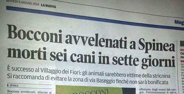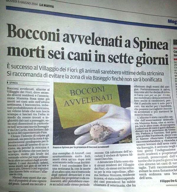 di VALERIA ROSSI – Da qualche giorno sto seguendo, tramite un’amica di FB letteralmente terrorizzata per il suo cane, la vicenda dei bocconi avvelenati che hanno già ucciso, a quanto pare, 16 cani tra Spinea, Mirano e dintorni, tutti in provincia di Venezia (il giornale qui a sinistra aveva pubblicato la notizia quando si era “soltanto” a sei casi).