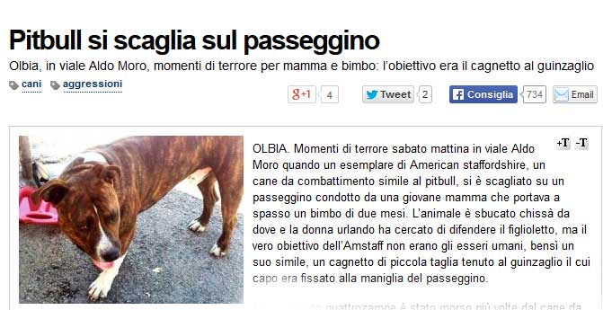 da cinofila di lungo corso non posso restare allibita di fronte all’articolo pubblicato dalla Vs. testata e titolato “Pit bull si scaglia sul passeggino”… quando si evince poi dalla cronaca che il cane non era un pit bull, non ce l’aveva col passeggino ma con un altro cane legato ad esso e che il tutto è finito bene (salvo qualche morso subito dal cagnetto).