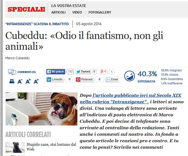 E invece il povero Cubeddu ha risposto con un secondo articolo, dal titolo “Odio il fanatismo, non gli animali”, nel quale – oltre a riuscire ad essere ancora più noioso – si dà ai voli pindarici per tentare di difendere l’indifendibile (ovvero se stesso) e di giustificare l’immane calderone di luoghi comuni cinofobi sfoderato in precedenza.