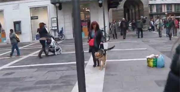 Per esempio, qui possiamo vedere l’approccio agli ostacoli frontali, dove il cane deve trovare una soluzione valida non soltanto per se stesso (che potrebbe tranquillamente passare sotto l’ostacolo), ma anche per la persona non vedente al suo fianco. Inoltre la modalità deve essere corretta: l’ostacolo va passato radente al suo fianco, in modo da lasciare spazio alla persona, ma anche lentamente, per evitare incidenti: