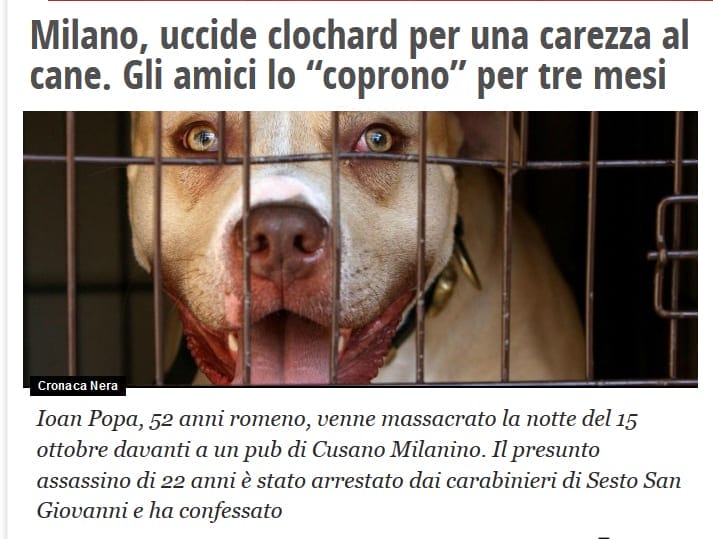 E’ evidente che il tentativo di accarezzare il cane è stato soltanto il pretesto per scatenare un odio legato all’intolleranza: non so neppure verso chi (verso lo straniero? Verso il rifiuto della società? Semplicemente verso il più debole?), ma che si trattasse di odio è lampante, perché non si arriva a uccidere a calci e pugni se non c’è dietro una bella carrettata di odio.
