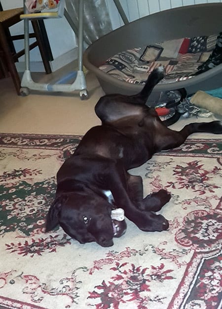 Sgranocchia un osso di dinosauro sul mio parquet – coperto dai molti tappeti che consentono ad Hero di non scivolare – che ormai è di un biancastro opaco e graffiato… e quando andiamo al parco a giocare bisogna essere veloci ed attenti a non farsi prendere sulle rotule dal cucciolo che gioca con i suoi amici.