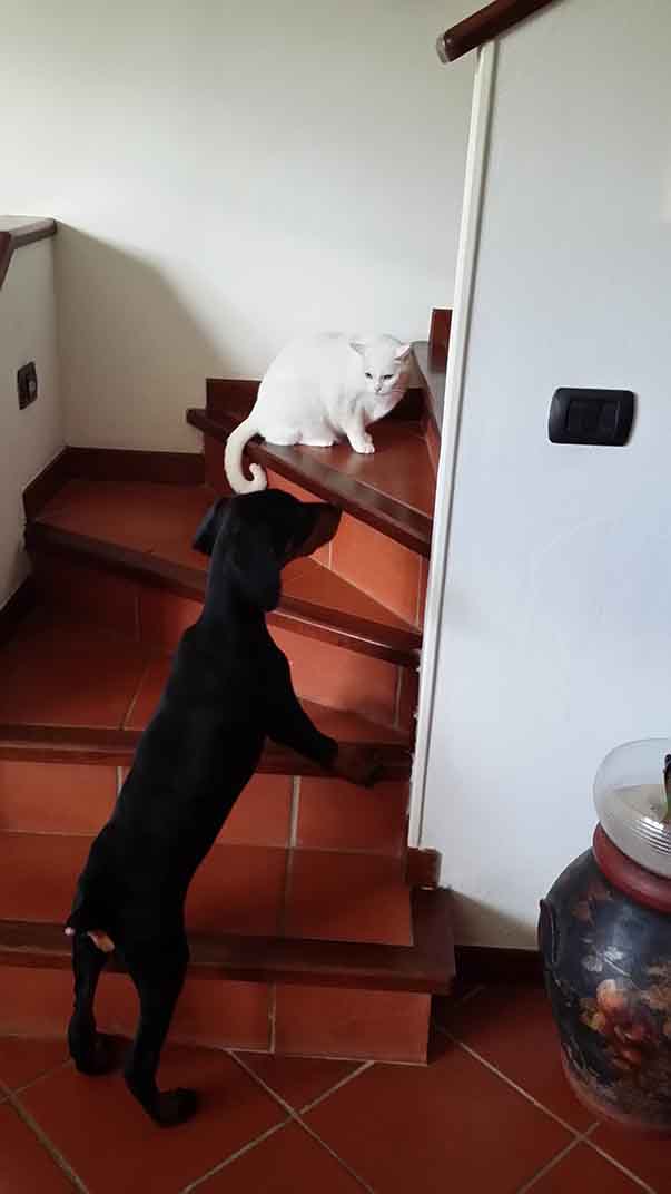 Con Caos il problema non si pone: dopo un periodo in cui la convivenza fra i due è stata idilliaca, qualche zampatina del tirannosauro in crescita, amichevole quanto si vuole ma pesantuzza per una gattina di quattro chili scarsi, deve aver convinto la medesima a ritirarsi al piano superiore, dove la bestiaccia mette rarissimamente zampa. Col risultato che Caos i gatti, dopo gli sberleffi che gli fa la gattina dei vicini (al di la della protezione della rete. Mica scema, la gattina) se li mangerebbe tutti volentieri a colazione. Le scarse volte che Nuvola scende le scale le abbiaia contro, non si capisce se per salutare o per qualche altro insano proposito molto meno lodevole.