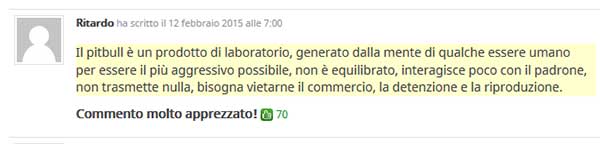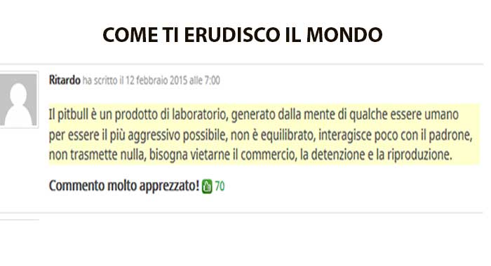 In un altro commento all’articolo sui Pitbull assassini si legge che l’indole aggressiva di questi poveri cani si evince da caratteristiche fisiche come agilità, muscolosità, occhi piccoli e poco espressivi…siamo senza speranza. Ci mancava il Cesare Lombroso dei cani….a breve toglierò il saluto a parecchie persone con queste caratteristiche…non si sa mai…p.s.provo ad interpretare la dicitura “cane creato in laboratorio”: razza di cane selezionata dall’uomo con caratteri fisici e caratteriali destinata all’uccisione di ogni tipo di essere vivente passi nelle sue vicinanze. ma che scemi quelli che si son comprati un barboncino. se ne trovano a volontà sotto le verze in campagna…anzi, addirittura in natura pronti all’uso…basta recarsi nei posti giorni e acchiapparne uno col retino per catturare le farfalle…p.s. i mi piace al Signor Ritardo sono aumentati…ditemi che sono ironici, per favore…