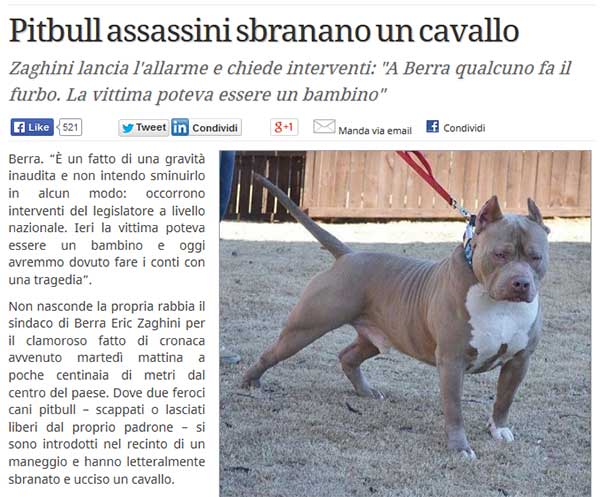 purtroppo i fatti non sono stati riportati correttamente dal giornalista (come spesso accade), abito nel paese in cui è avvenuto il fattaccio, la cavalla è stata effettivamente attaccata e uccisa dai due cani, erano presenti anche altri due cavalli e i proprietari hanno dovuto attendere quasi 3 ore l’ intervento di carabinieri e medico veterinario per poter calmare la situazione, (poichè i cani non si allontanavano e gli altri due cavalli ovviamente erano spaventatissimi e dovevano essere messi in sicurezza), a discolpa dei due cani si deve dire che purtroppo venivano da una situazione allucinante, erano mesi che i cittadini denunciavano alle autorità la detenzione da parte di persone a dir poco “sospette” di cani in condizioni inumane, venivano spesso trovati liberi di vagare per il paese e tutti in zona sapevano che i cani venivano maltrattati ed erano denutriti, c’è il sospetto che venissero utilizzati anche per combattimenti clandestini, purtroppo oltre ad adulti avevano anche diversi cuccioli.