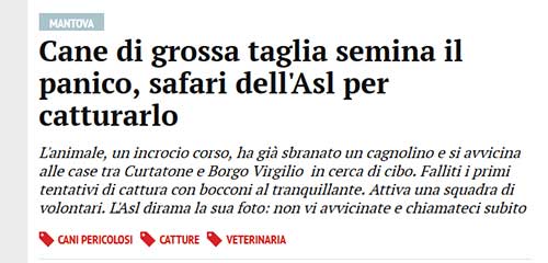 Ogni santo giorno mi dico: “Ci sarà un limite, da qualche parte…” ed ogni santo giorno vengo smentita: ieri, per esempio, sulla Gazzetta di Mantova, ho trovato termini che fino ad oggi non avevo ancora visto usare da nessuno, parlando del tentativo di cattura di un cane randagio: “Safari” (già nel titolo) e “caccia grossa” nel testo.