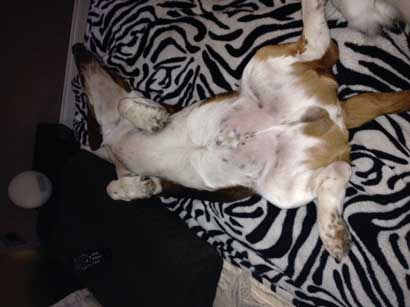 Carissima, vivo la tua stessa esperienza ed è esattamente così!! Ahahahah!!! Solo che oltre a chiedermi:”Scusi, signora, è un cane?”, dal veterinario una ragazza ha esclamato:”Mamma guarda, un cane limousine!!” E poi puoi leggere tutti gli articoli di Valeria Rossi, ma alla fine questa è la sua faccia mentre dorme beato sul mio cuscino dopo mille divieti e 40000 NO!! Il basset non è testardo, è solo … diversamente cane :P!!