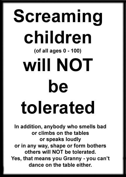 Qual è, allora, il cartello che vorrei leggere sulla porta di qualsiasi esercizio pubblico? Più o meno questo: “Bambini e animali sono ben accetti: ma se si dimostrano ineducati e incivili verranno cortesemente invitati ad uscire SUBITO”.