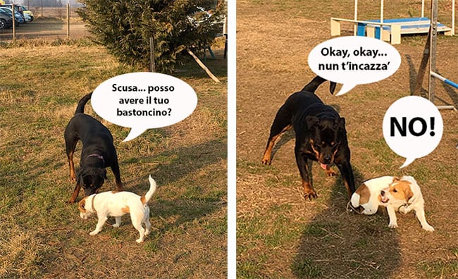 Milly, la compagna di giochi di Samba in queste foto, è un Jack russell e quindi NON è certo l’emblema del “peace and love”… eppure, grazie alla socializzazione, è capace di comunicare con notevole efficacia, facendosi valere ma senza andare a cercar rissa.