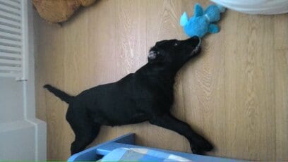 Due cucciole di labrador, nere, di 11 settimane, che si agitano con una frenesia che mette in ansia anche me (non si agiteranno troppo per il loro piccolo cuore…?).