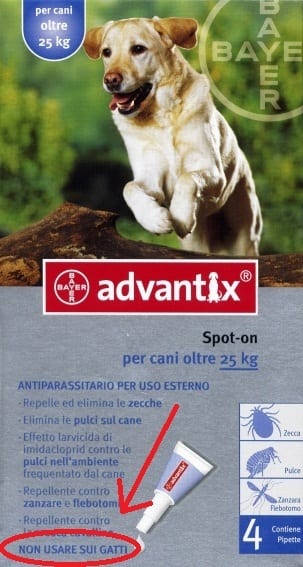 A una mia amica si è intossicato gravemente il gatto dopo che lei aveva utilizzato un prodotto solo per cani, fiduciosa nel fatto che il suo cane e il suo gatto si detestassero cordialmente e stessero sempre a distanza di almeno tre metri l’uno dall’altro. Ovviamente i due scelsero proprio il momento della somministrazione dell’antiparassitario per diventare amiconi: il gatto cominciò a coprire il cane di baci, strusciatine e leccatine… e finì di corsa dal veterinario, salvandosi per il rotto della cuffia. Postilla comica: la mia amica mi raccontò che il suo gatto, una volta ripresosi, tornò a mantenere grandi distanze dal cane, guardandolo pure con estremo sospetto ogni volta che lo incrociava per casa.