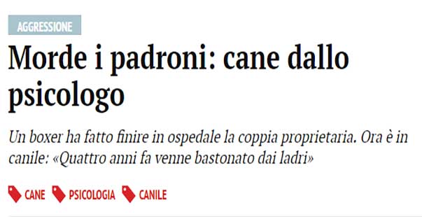 Il secondo invece e’ un pezzo piu’ articolato, che riporta un virgolettato e quindi teoricamente piu’ serio. Ma c’e’ un pero’: il titolo fornisce ovviamente una chiave di lettura e non potrebbe essere altrimenti, ma la chiave di lettura – avvalorata dal virgolettato dell’esperto e quindi autorevole per chi legge in modo acritico – e’ che il cane mordace va portato da uno che gli curi l’anima. Non ho usato questo termine a caso ma proprio perche’ nella sua vaghezza ci sta tutto e il contrario di tutto D’altra parte il virgolettato – che non necessariamente corrisponde al senso del commento che e’ stato rilasciato – suggerisce uno scenario dove un esperto ha visto un cane un anno e mezzo fa, lo tiene in osservazione per dieci giorni ora e riconduce con una buona dose di sicumera la sua diagnosi a un evento molto traumatico di quattro anni fa ma forse anche al trasloco subito recentemente. Bene cosi’, mi verrebbe da dire, lo spicologo del cane lo puo’ fare chiunque, persino io che notoriamente ho la sensibilita’ di uno scaricatore di porto e se fossi senza lavoro il primo pensiero dopo aver letto l’articolo sarebbe: stai a vedere che con poca spesa mi riciclo in psicologo dei cani anch’io, noleggio i DVD di Zanna Bianca e Io ti salvero’, li guardo tre volte di fila davanti a due chili di pop corn e sono pronto a dispensare diagnosi come se piovesse tanto un trauma “infantile” non si nega a nessuno.