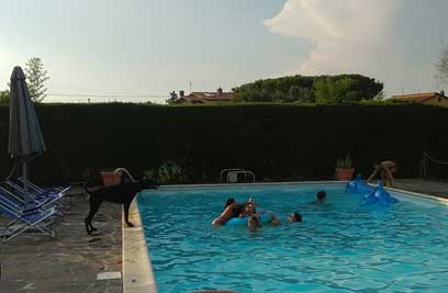 Certamente per tutti la sorpresa è stata Zoe (beh, non per me, dato che conosco il mio cane in queste situazioni alle quali è stata abituata sin da cucciola), che ha dimostrato un equilibrio, una pazienza ed una tolleranza assoluti con i bambini, mantenendo un riserbo da nobildonna unito ad una protettività da guardia del corpo per tutti indistintamente (ogniqualvolta i ragazzi si allontanavano correndo, lei subito dietro a controllare, ritornando di vedetta sotto il portico una volta verificata la situazione); e quando qualche estraneo si affacciava al cancello, subito di corsa a vedere di chi si trattava con un fare degno di un buttafuori (“Altolàchivalà?”): amo questo cane!