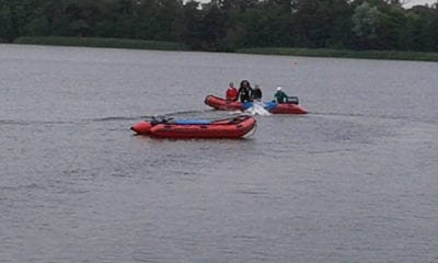 Cane e conduttore sono sulla riva. Ad una distanza che può variare al solito tra i 25 e 30 metri si trova, alla deriva, un gommone.