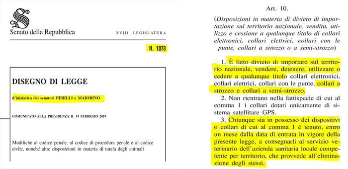 di DAVIDE BELTRAME – Sta facendo un sacco di scalpore sui social il disegno di legge n. 1078 proposto dai senatori Perilli e Maiorino del Movimento 5 Stelle e di cui viene condivisa in particolare la parte che vorrebbe vietare a livello nazionale l’importazione, la vendita e l’uso tra gli altri dei collari a strangolo e semi-strangolo, con addirittura l’obbligo di consegnare all’ASL quelli già in proprio possesso. Proposte conenute nel disegno di legge e che vedete evidenziate anche nella foto di apertura dell’articolo.