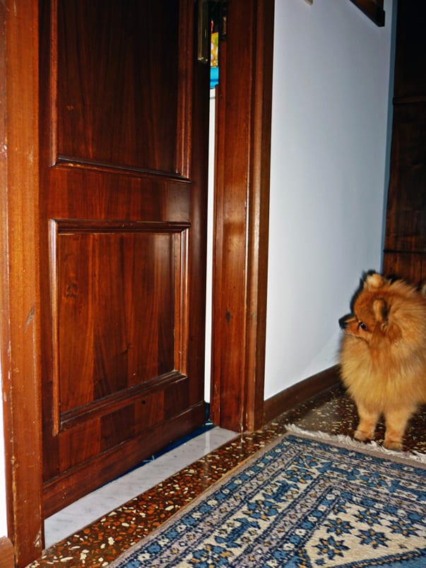 2. In realtà non rimane mai solo perché in casa c’è mia madre (anche se faccio in modo che lei stia un po’ appartata, visto che è anziana e pesa meno di lui). Quando mi assento oltre un certo tempo, nulla sfugge ai suoi denti (ha già fatto fuori due citofoni e l’apriporta e…molto altro). Ritengo sia per noia, più che per ansia …spero…