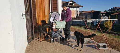 Nei giorni seguenti anche il resto della banda ha avuto incontri più o meno ravvicinati con Giada: Fabiana ha iniziato a stare un po’ meglio e poter nuovamente uscire con me quando era il momento di badare ai cani, quindi nel primo caso Sumo e Mina, i due cuccioli di Samba ancora in allevamento, hanno potuto gironzolare intorno alla carrozzina insieme a Destiny: a livello di sicurezza e guardia della pupa siamo piuttosto ben forniti.