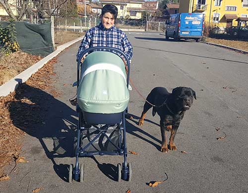 Ultima ma non ultima, Medusa è quella che ha avuto l’incontro maggiormente ravvicinato, perché un giorno Fabiana è uscita in giardino con Giada in braccio nel comodissimo megasaccodabambino quando era il turno di uscita dei rott adulti, ma mentre Tonino e Samba hanno reputato più interessante continuare a dedicarsi alla distruzione dei rispettivi giocattoli, Dusa ha visto bene di far valere il suo status di cane cozza, appiccicandosi a Fabiana.