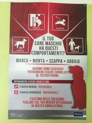 Appendere una locandina del genere in un ambulatorio veterinario, dove comunque c’è il “proprietario medio”, quindi in gran parte comunque persone che non hanno una gran cultura cinofila e magari si preoccupano anche per dei comportamenti normali, è a mio avviso davvero deleterio. Pensiamo soltanto al classico proprietario che vive in condominio e magari si sente rompere le scatole dal vicino “perchè il cane abbaia” (e magari abbaia giusto qualche minuto, ma il vicino è particolarmente “sensibile”): istintivamente potrebbe pensare di affidarsi alla “terapia medica” per ridurre il testosterone.