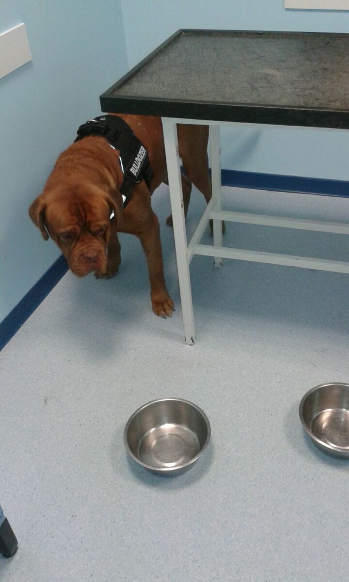 non si capisce mai che faccia, presumo aiutarmi a tenerlo fermo, la seconda si occupa del sito di prelievo e di tenere l’ago in posizione, la terza è accucciata sotto il tavolo a basculare la sacca per evitare che il sangue coaguli e comunica la costanza del flusso. Con Baloo in poco meno di 10 minuti abbiamo sempre finito, ha delle vene bellissime e dona rapidamente, con Trimix ci si impiega un poco di più.