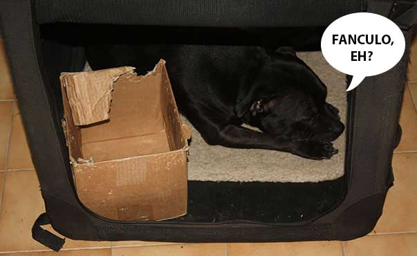 c) gli scatoloni. Di qualsiasi tipo, forma e colore. E siccome, come dicevo poc’anzi, i suoi giochi preferiti Samba adora portarli nel kennel della Bisturi, questo è il risultato: