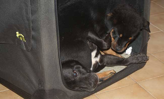 La sequenza che avevo pubblicato su FB era la seguente, che ritraeva l'”invasione” da parte di Samba degli spazi privati della staffy (ovvero il suo kennel):