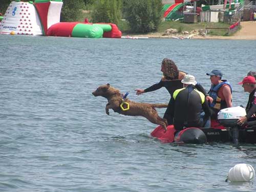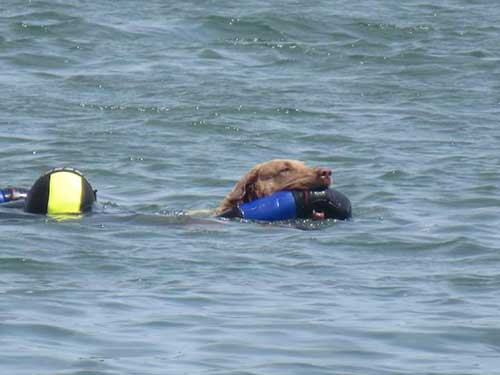 Terzo esercizio. Recupero di due figuranti. I due figuranti lasciati dallo stesso gommone in movimento simulano panico. Il cane parte. Dopo 5 metri di nuoto il giudice indica ad uno dei due di svenire. Il cane va su quello che finge panico, lo fa aggrappare all’imbrago, poi va verso il figurante inanimato, lo prende per il polso e li riporta a riva.