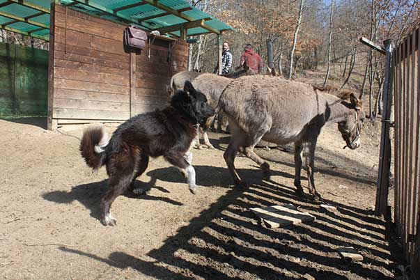 Ieri non è che abbiamo potuto vedere nulla di particolare, anche perché al momento i soggetti con cui sta lavorando Vittorino sono tutti cuccioloni: ha una splendida pastoressa apuana di nove mesi, un kelpie arrivato direttamente dall’Australia e il cane da guardiania, cucciolone anche lui (13 mesi), un incrocio caucaso-maremmano/abruzzese che si sbaciucchia le oche, fa lo scemo con gli asini (che infatti rispondono a calcioni, vedi foto più in basso) ed è dolcissimo con le pecore.