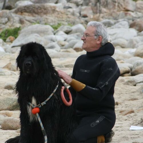 recupero tramite cima pendente di un gommone posto alla deriva a cinquanta metri da riva. Il cane parte e torna a riva;