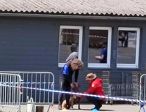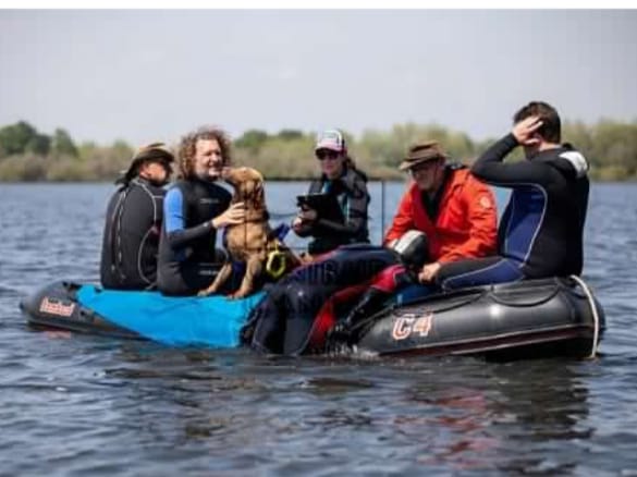 Recupero tramite presa al polso di un figurante posto a cinquanta metri da riva su un materassino. Il cane parte e torna a riva;