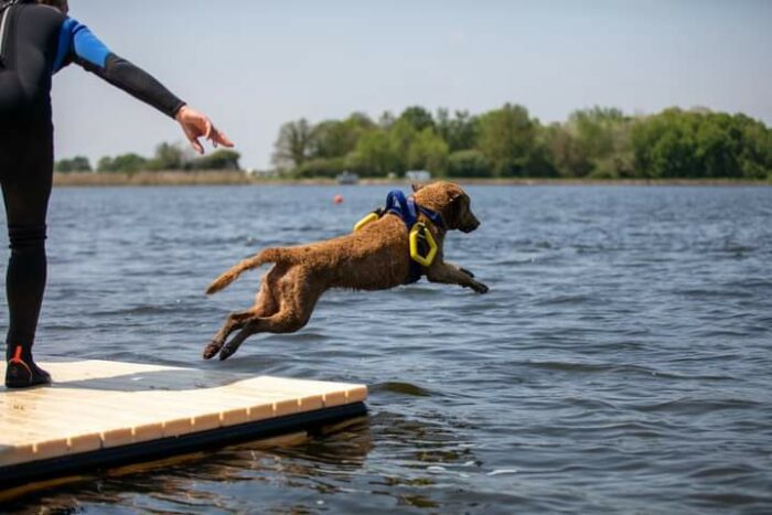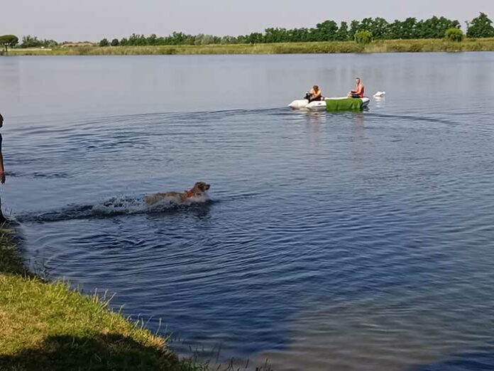 Le faccio assaggiare la piattaforma. Non scivola. Il tuffo le piace e poi secondo me partire dall’alto è meglio, per via di una prospettiva migliore che il cane può avere. Ci imbarchiamo sul primo gommone e ci posizioniamo sulla boa di segnalazione posta a 50 metri dalla riva.