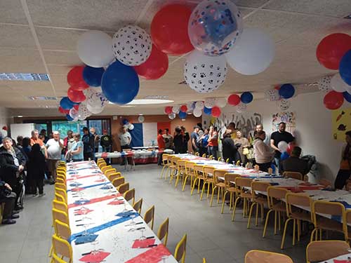 La sala dove siamo stati ospiti esplodeva di colori francesi, blu-bianco-rosso ovunque, sul tavolo sui muri, sul soffitto. Durante la serata si è svolto il sorteggio degli esercizi ed il sorteggio del numero di partenza in gara.