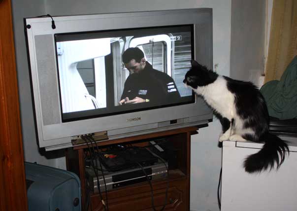 Prendo la gatta e la porto in sala, dove c’è un’altra TV che potrebbe guardarsi finché le pare, senza dar fastidio a nessuno: però quella TV non le interessa minimamente. Le piace solo quella della camera.