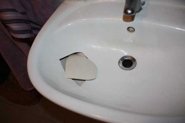 Peccato che l’altro ieri abbia sentito un CRACK particolarmente sinistro: mio figlio aveva dimenticato di imboscare la sua schiuma da barba, un bel flaconazzo grosso e pesante. Il risultato lo vedete nella foto a destra.
