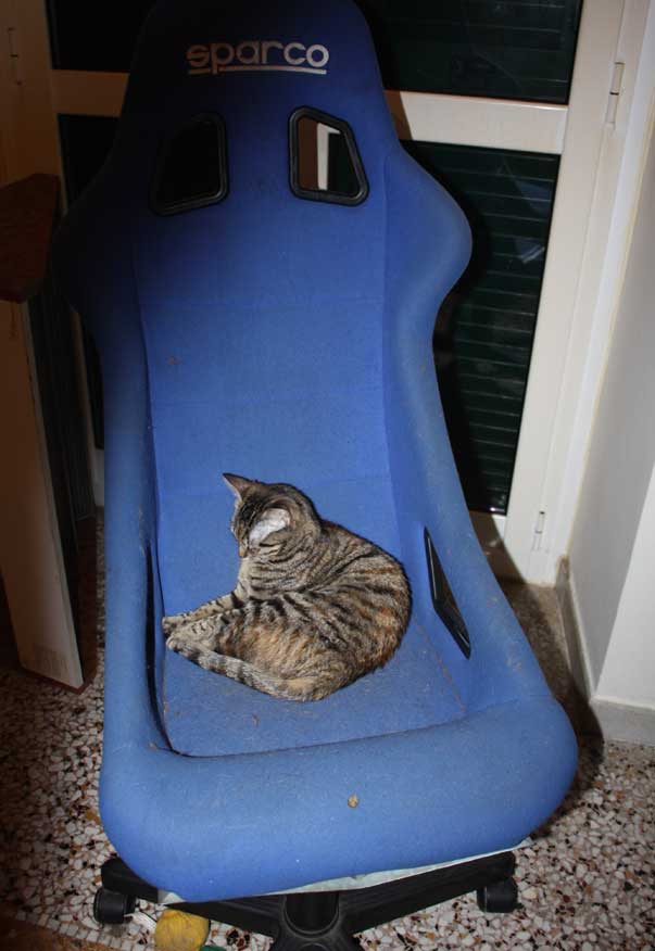 Nel frattempo Venerdì si è trasferita sulla sua sedia privata (ne hanno una per una: due sedili da rally che il marito ha trasformato pensando di farne due originali e simpatiche sedie per umani. Come no) e pensa che potrebbe anche dormire un po’: ma ovviamente Nemesi è di diverso avviso e vuole giocare. Salta quindi a sua volta sulla sedia della sorella e comincia a prenderla a zampate e capocciate finché Venerdì accetta di giocare a rincorrersi. Ovviamente con immani salti e volate da una scrivania all’altra, derapate sui miei piedi, arrampicate sui muri, capocciate nella mia sedia e così via.