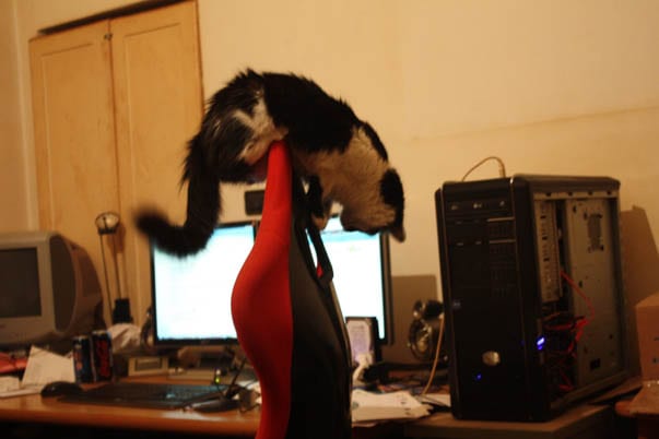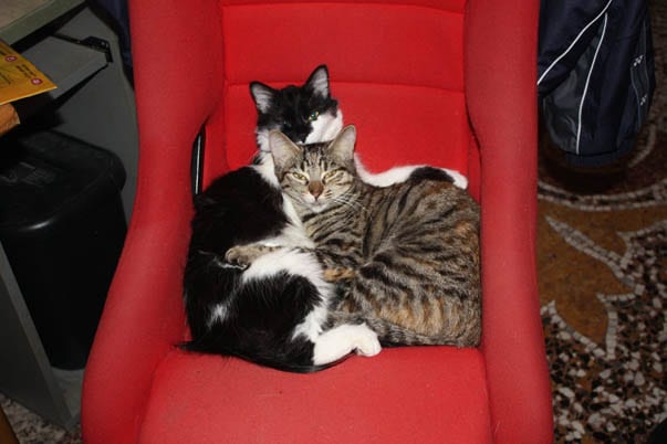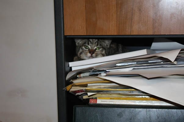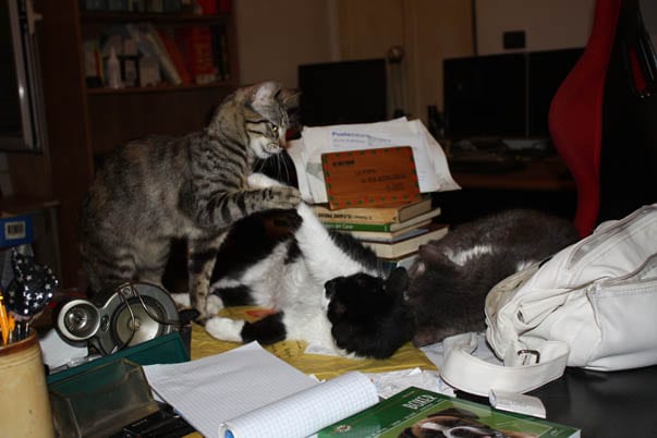 Ora, giuro: non ho i mobili da ufficio della famiglia Addams. I miei cassetti non fanno screeeeeckkkkk, non cigolano, non fanno praticamente nessun rumore scorrendo sulle loro guide. Ciononostante, quando mi volto col premietto in mano, le gatte son diventate due.