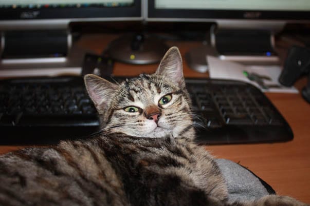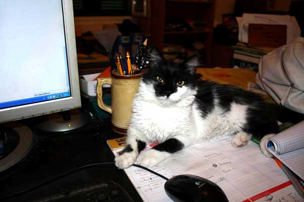 Entro quattro secondi arriva Venerdì che salta davanti al monitor e fa purrr purrrr ron ron (“Sì, mi hai sgridato, sì, lo so che ti sei arrabbiata, ma adesso facciamo pace, vero? Premietto?”