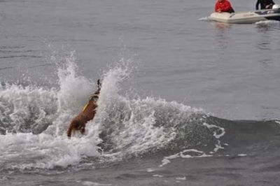 Torniamo alla gara. Per noi in acqua 4 minuti di nuoto dietro il gommone, recupero di un remo lanciato dal gommone con cane che parte da gommone; recupero di un figurante partendo dal gommone; recupero di un figurante partendo da riva e recupero di manichino sempre partendo da riva. Mentre lavoravamo c’erano onde belle onde ma onestamente fattibili senza direi nessun grosso problema.