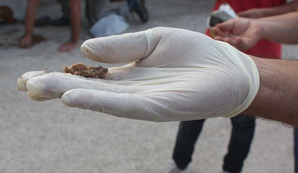 Si prende un bocconcino molto gradito al cane e lo si tiene poggiandolo su indice e medio, come nella foto: dopodiché si appoggia il pollice sopra alle altre dita. In questo modo il cane vede e sente il cibo, ma non lo può raggiungere.