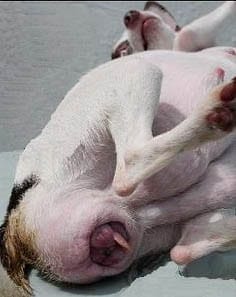 Successivamente, il cucciolo viene vigorosamente lambito dalla cagna in modo che le narici e l’orofaringe vengano liberate dai muchi ancora presenti nelle vie respiratorie. Nei casi in cui la cagna non possa (o non sappia) eseguire tali procedure di rianimazione, una volta liberato il cucciolo dagli invogli e reciso il cordone ombelicale (io preferisco lacerarlo con le dita e non tagliarlo di netto, a 4-5 cm dall’ombelico, facendo molta attenzione a non creare trazioni sulla parete addominale) si può stimolare la respirazione tramite delicata compressione addominale, insistendo particolarmente intorno alle regioni genitale e ombelicale, in quanto sedi di riflesso respiratorio durante i primi 3 giorni di vita. Anche la stimolazione tattile della zona lombare può contribuire a indurre il pianto e a migliorare la pervietà delle vie respiratorie.