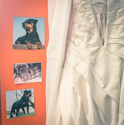 Presenze, queste ultime, molto gradite dato che una volta finito con il trucco si sarebbe dovuti passare a un momento piuttosto delicato: la vestizione di Fabiana. L’abito attendeva nel posto d’onore della casa: accanto alle foto dei rottweiler.