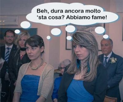 Prima del pranzo c’è stato un momento molto traumatico per gli sposi: mentre gli invitati hanno infatti avuto il permesso di assaltare il buffet, noi abbiamo dovuto sbrigare la pratica delle classiche “foto del matrimonio”. Momenti che hanno visto elevarsi il livello di pirlaggine a livelli davvero molto alti, con un