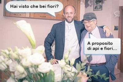Ore 10.45 – Per fortuna, seppur in puntuale ritardo, Adelchi ha fatto in tempo a presentarsi per qualche foto di rito, prima di accompagnare il futuro sposo in comune. Ha colto anche l’occasione per impartire a Davide alcune essenziali “pillole di saggezza” sulla vita di coppia.